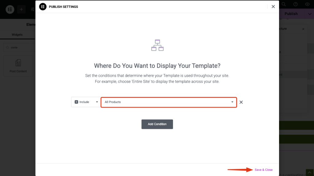 - Select to display the template for All products, click Save & Close and now you will be able to see the content displaying using the Elementor