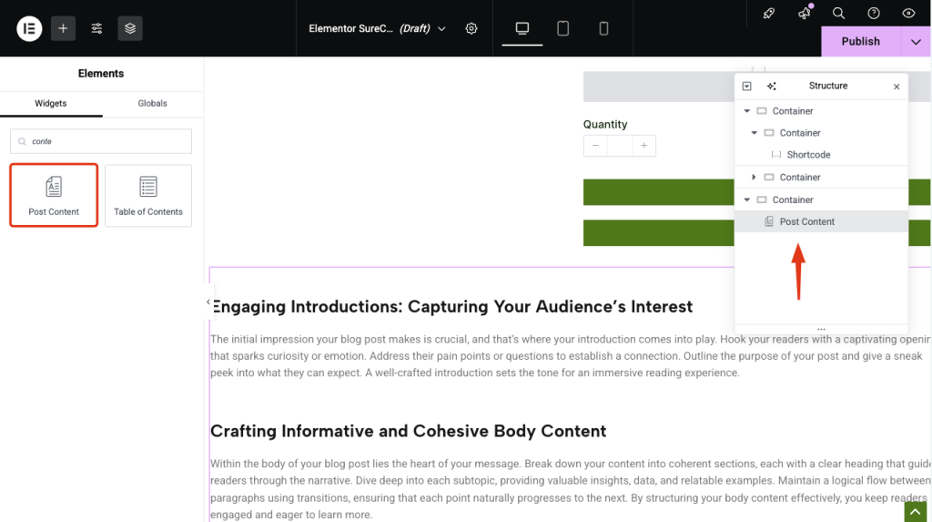 - After opening the template in Elementor, locate the content element and use the drag-and-drop editor to place your content element exactly where you want it to show up. Refer to the screenshot below to help you ensure perfect placement.