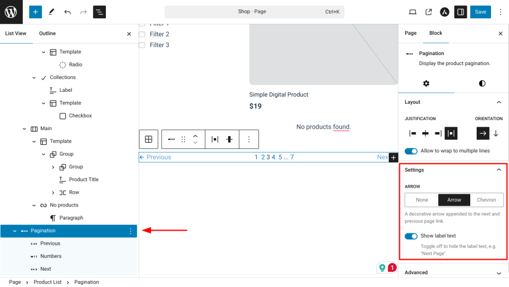 This feature adds Next and Previous buttons, allowing users to easily navigate between pages. Additionally, it displays a message indicating the total number of items across all pages. You can rearrange these elements and choose between various pagination icons—or none at all, if preferred.