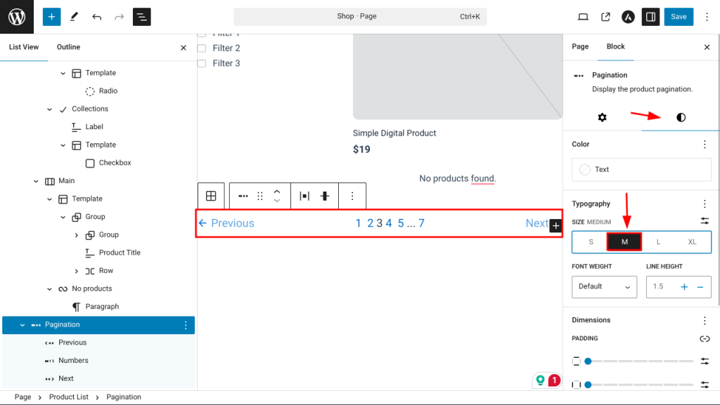 You also have the flexibility to customize the pagination font size. Use the dropdown menu to adjust the font size for the page numbers, as well as the Next and Previous buttons. Each can be styled individually to better fit your design.