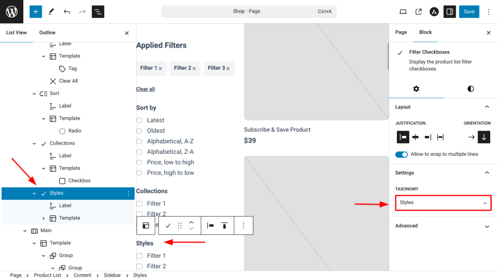 To add a filter, duplicate an existing filter block, and in the settings panel on the right, select the desired taxonomy under the Taxonomy dropdown. You can also rename the filter to make it more descriptive and better suited to your needs.