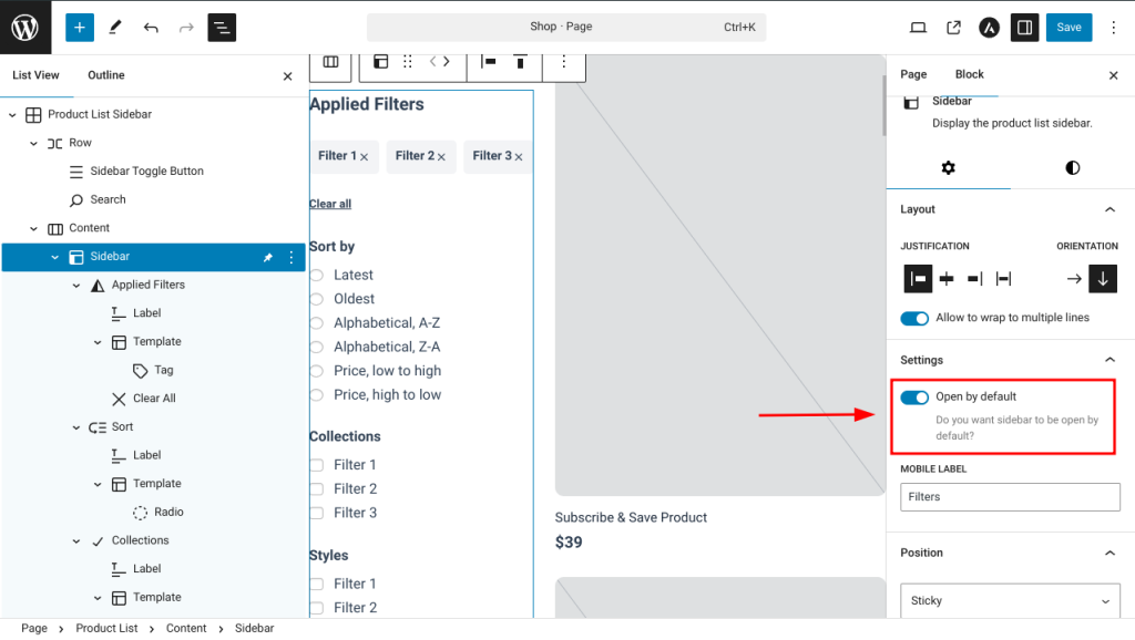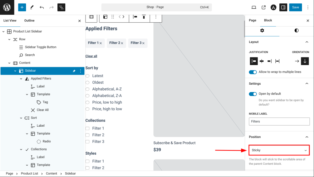 You can adjust the position of the block by setting it to either Default (fixed) or Sticky. Selecting the Sticky option ensures that the sidebar remains fixed to the scrollable area while users navigate through the product list.