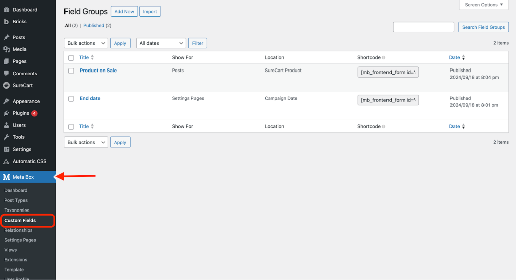 - Navigate to Meta Box > Custom Fields.