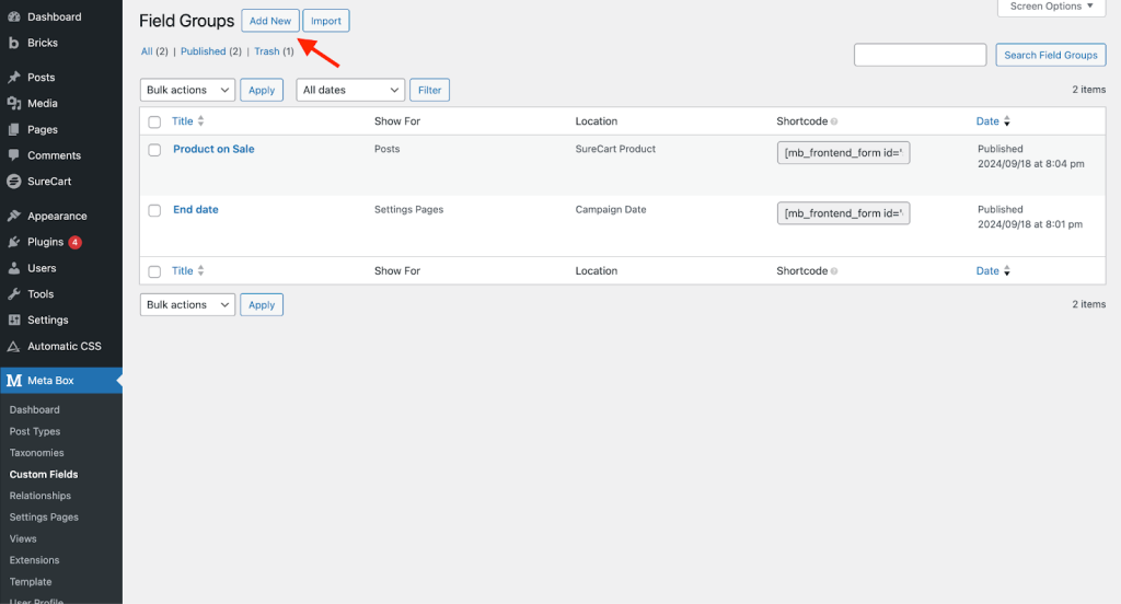 - Here, click Add New to create a new field group.