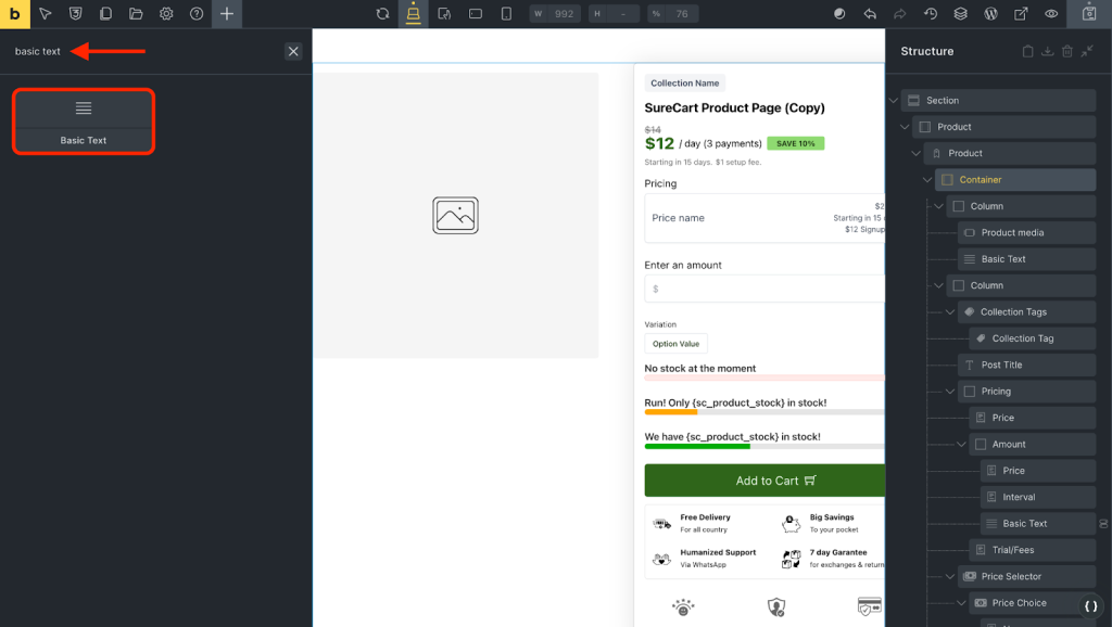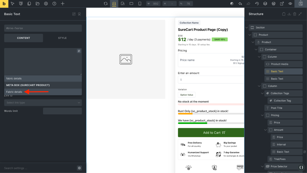 - Drag the “Basic Text” field anywhere on the product page where you want to display the custom field.