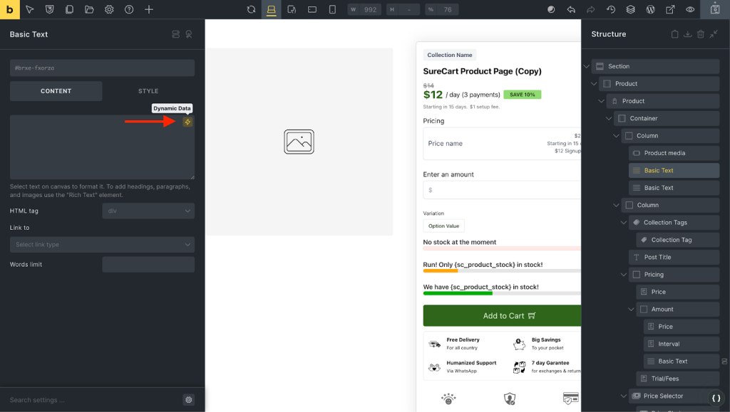 - Select the basic text element, delete any text inside of it, and click on the following “Dynamic Data” symbol inside.