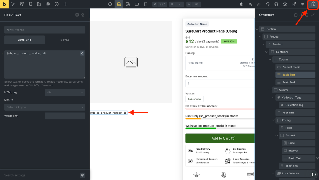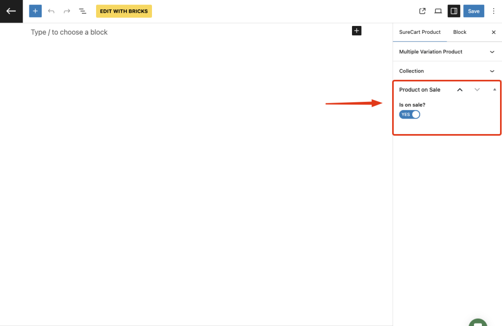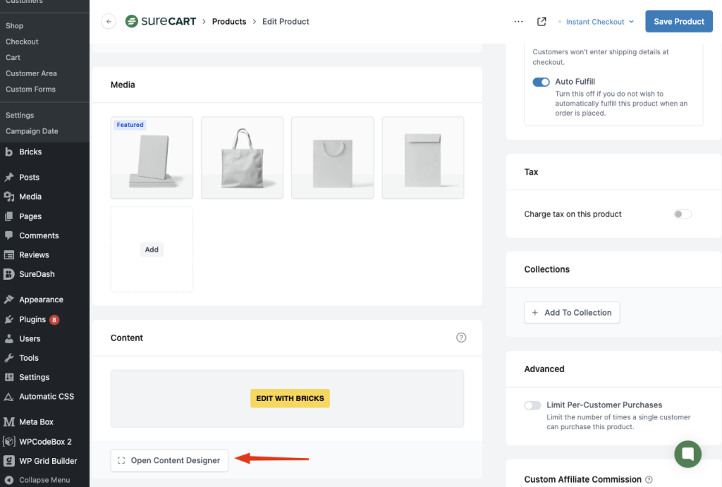 To do that, open your product template in the page builder of your choice. For this guide, we’ll demonstrate using the Bricks builder, but this can also be done using the block editor.