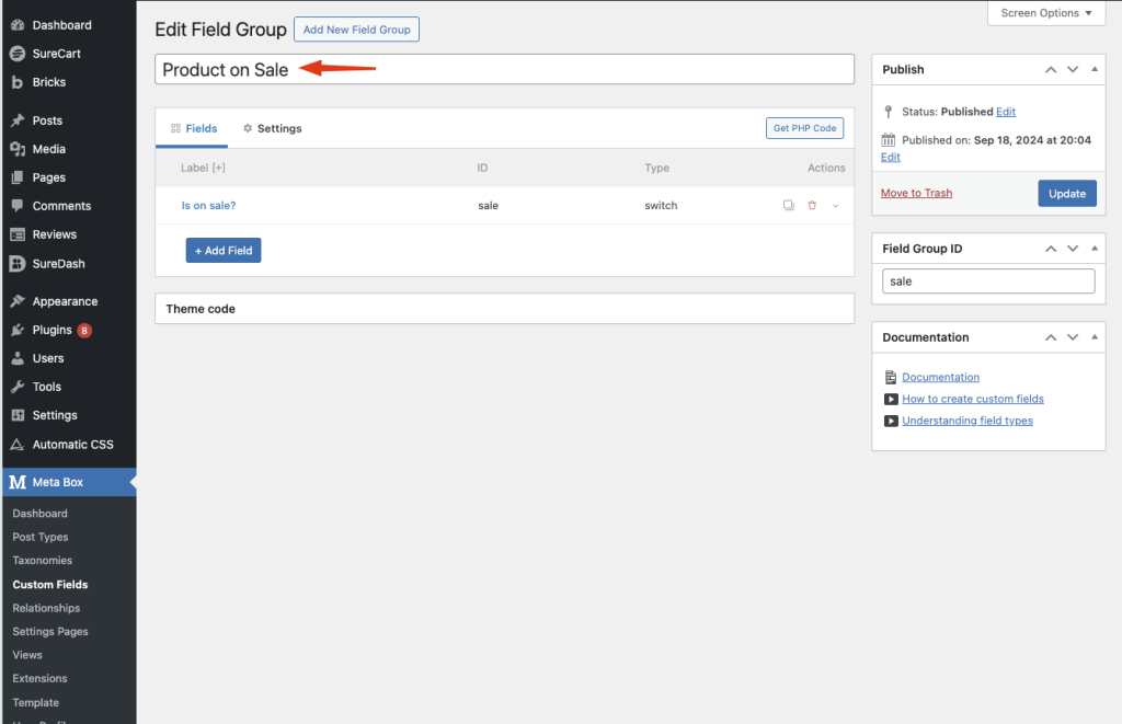 - Under Settings, choose “SureCart Product (sc_product)” along with the “Post Type” dropdown. This ensures the custom field will show up on your product pages.