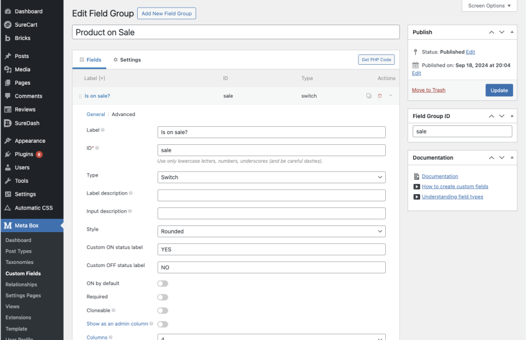 Click the “Publish” button on the right to add the custom field to your SureCart product settings.