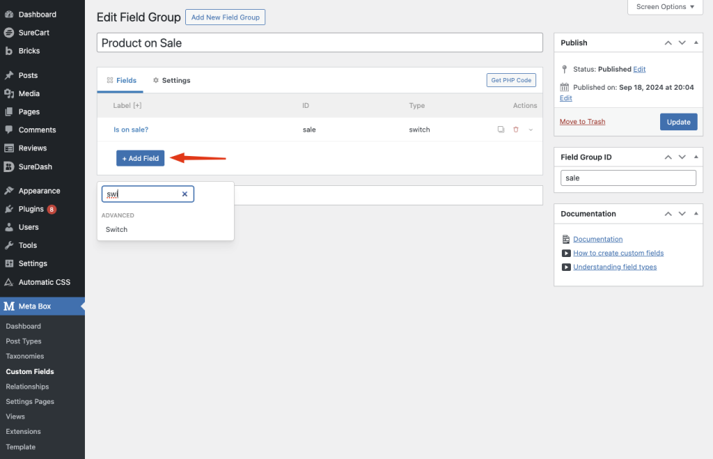 For this tutorial, we’ll use the MetaBox plugin as an example, but you can use any tool you prefer, such as ACF. These tools can recognize your SureCart product post type and make it easy to add custom fields.
