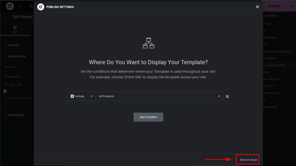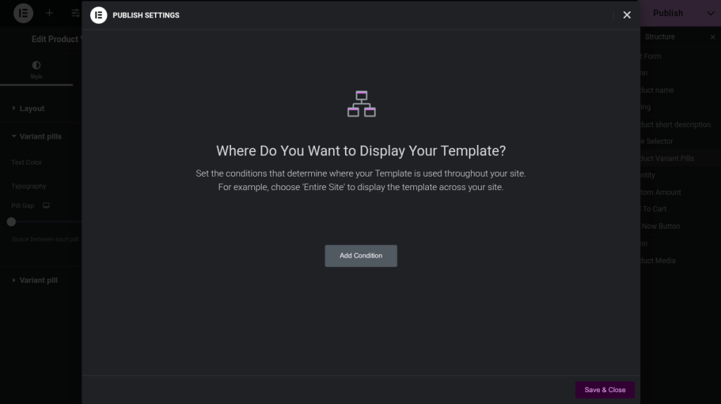 - A prompt will appear asking, “Where Do You Want to Display Your Template?” Click the Add Condition button to specify where your template will appear on your site.