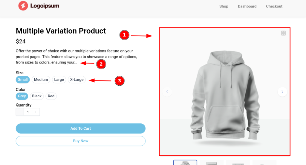 Preview your product page on the frontend to verify all elements appear as intended. In this example, we’ve implemented: