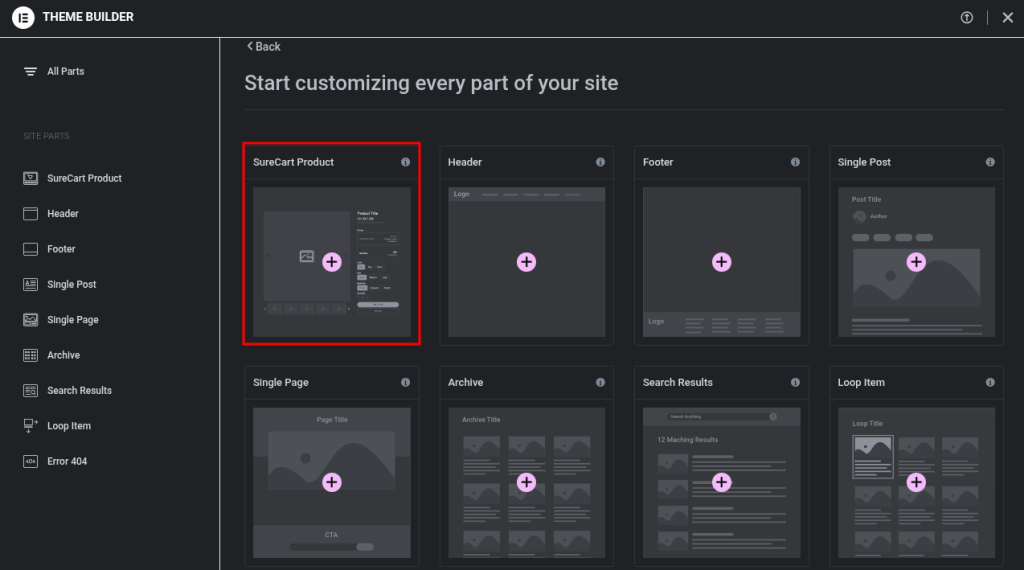 Creating a SureCart product template follows the same process as other Elementor templates, with the key difference being the selection of the SureCart Product layout.