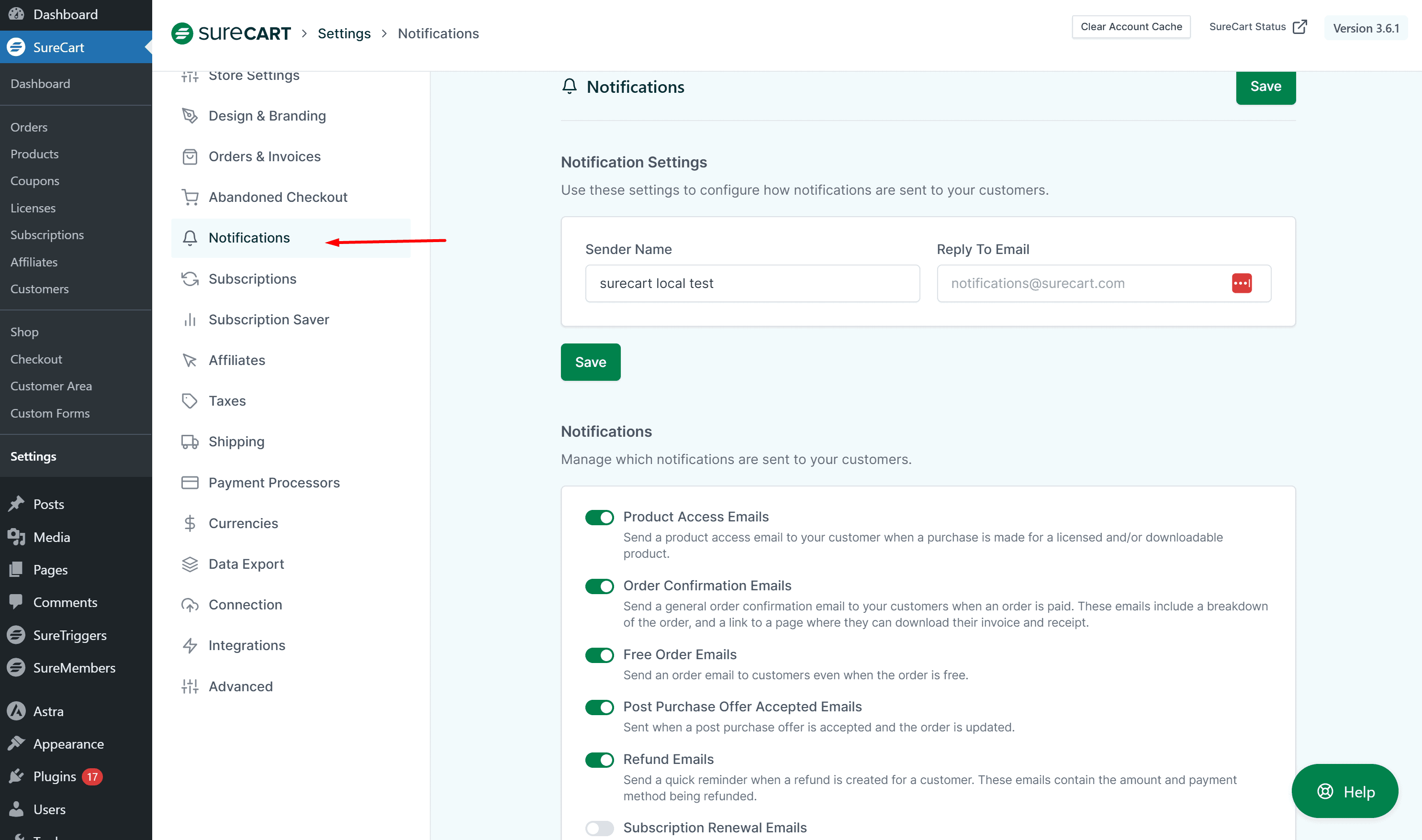 - To do this, simply navigate to the SureCart Settings > Notifications.