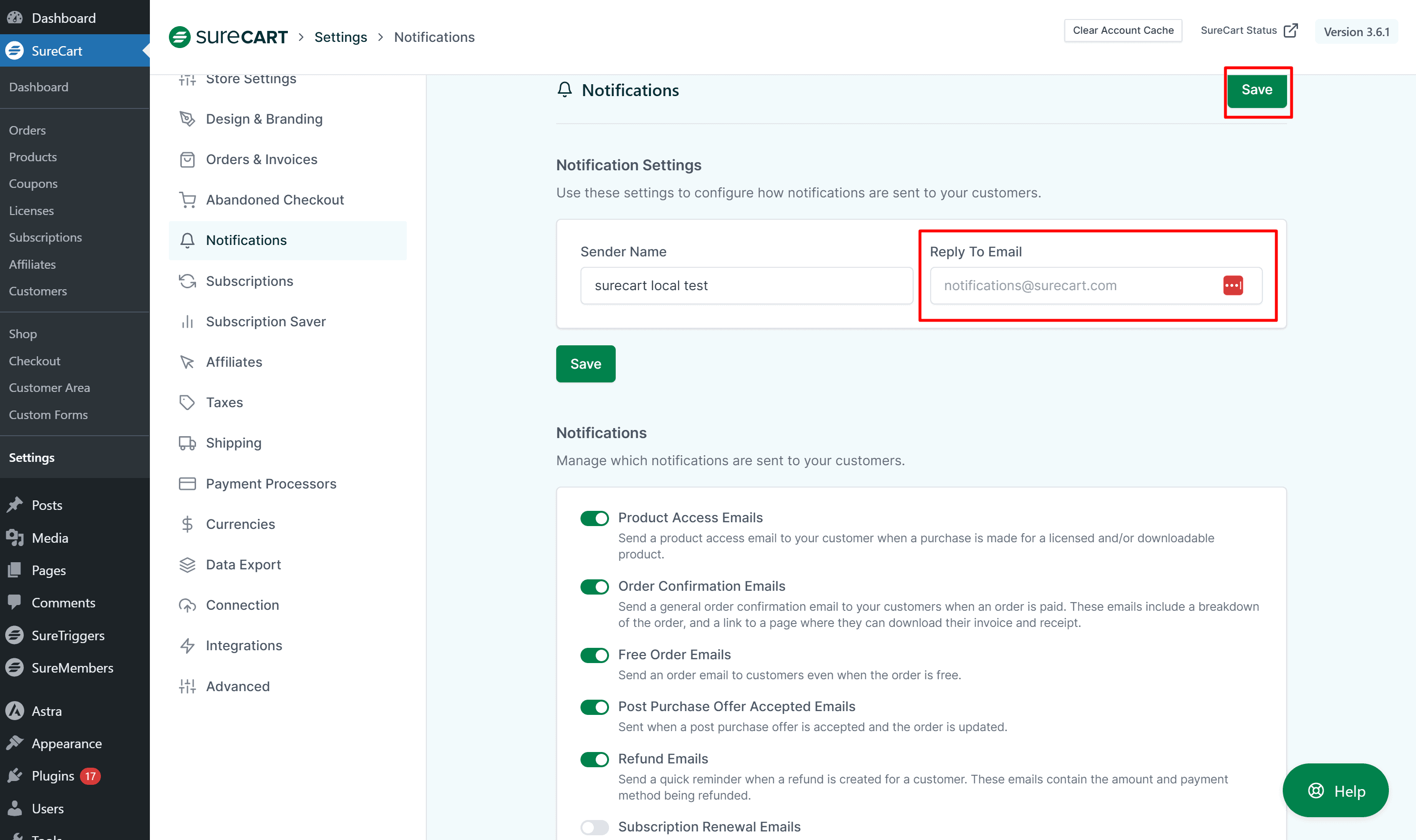 SureCart lets you choose the sender name and reply to the email address for all store notifications sent from your store.