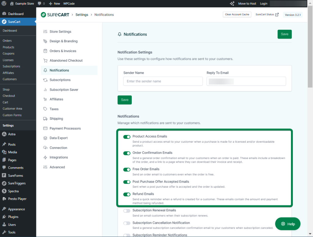 Finally, click on the Save button and the respective SureCart notifications will be turned off.