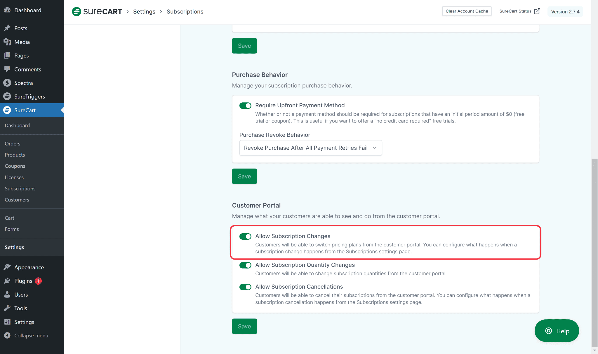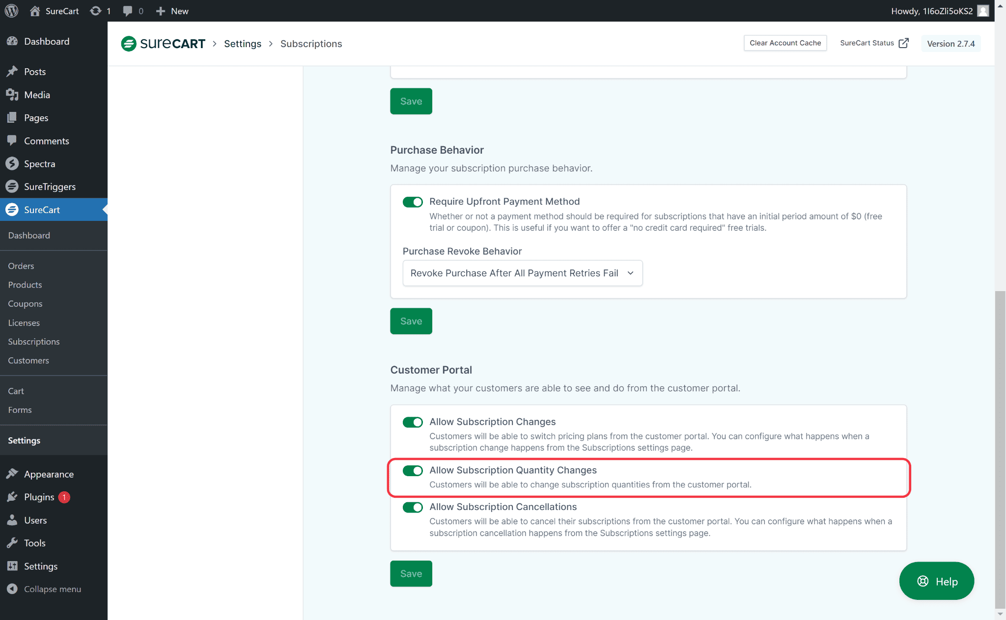 Allow Subscription Quantity Changes: Enabling this option allows customers to directly modify the number of subscriptions they have through their customer portal, eliminating the need to repurchase plans.