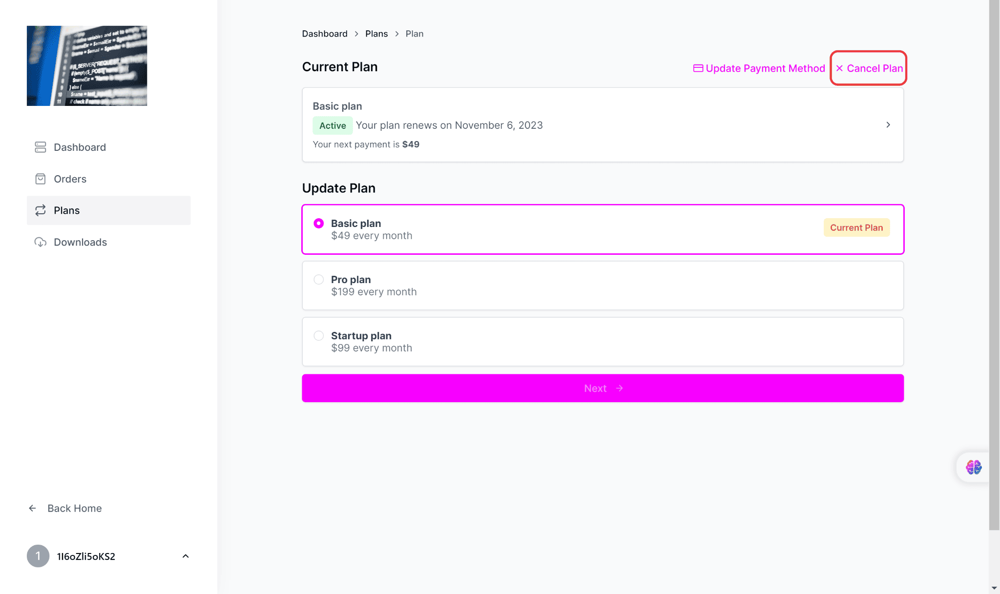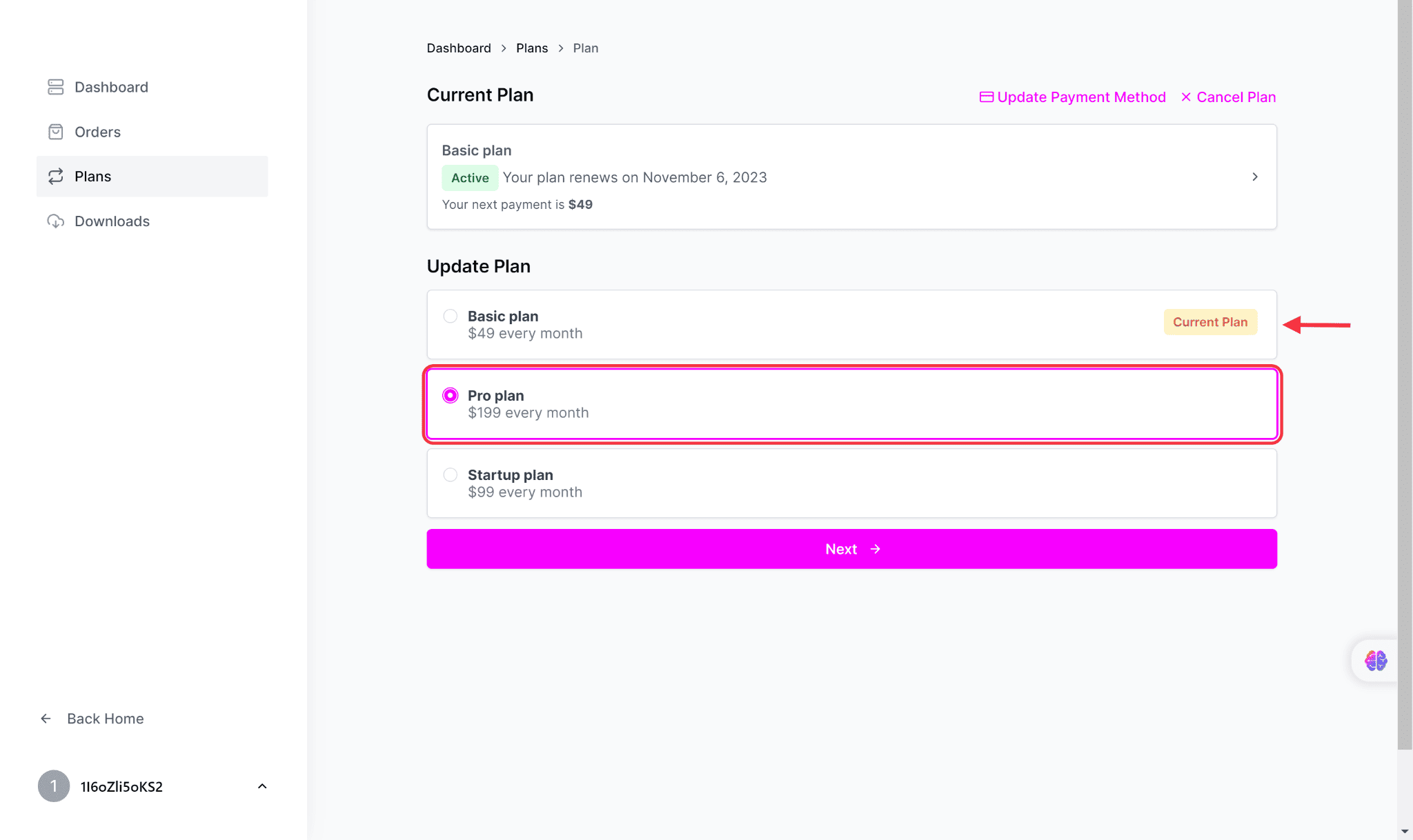 This is how it appears from the customer portal, on this screenshot we see the current plan is the Basic Plan and we are going to upgrade to the Pro plan.