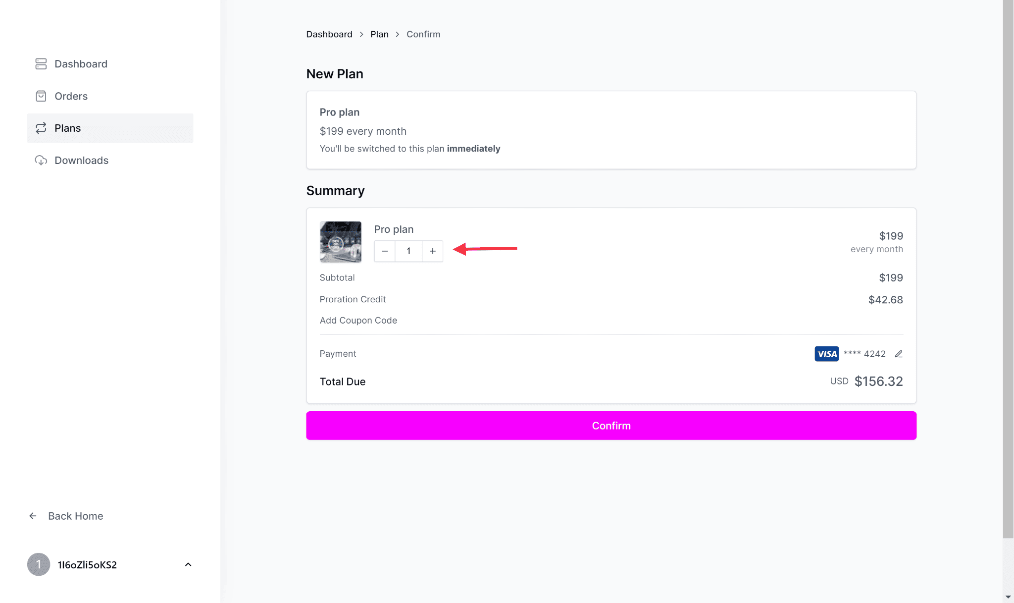 This is how it appears on the customer portal. In the screenshot, the user is trying to increase the quantity of their subscription.