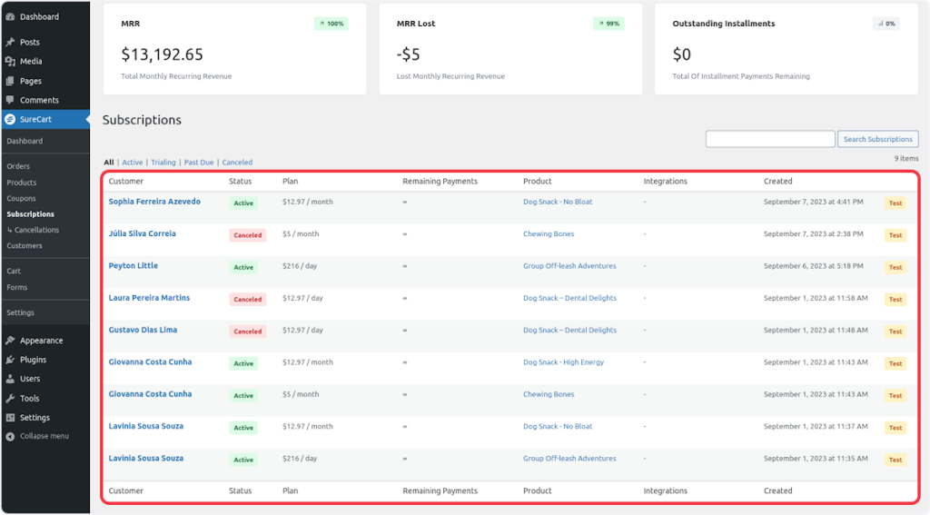 Towards the end of the page, you’ll find a table listing all subscriptions, ordered with the most recent at the top. You can easily filter these subscriptions with a single click, choosing from options such as All, Active, Trialing, Past Due, and Canceled.