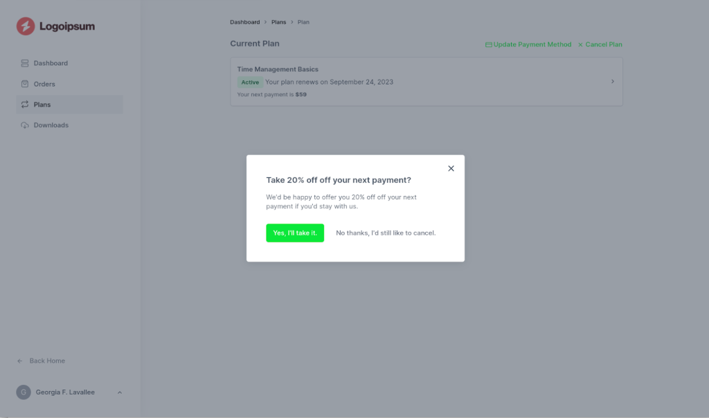 When customers click on “Cancel Plan” and choose the “Too Expensive” option in the pop-up, they will see the screenshot below.