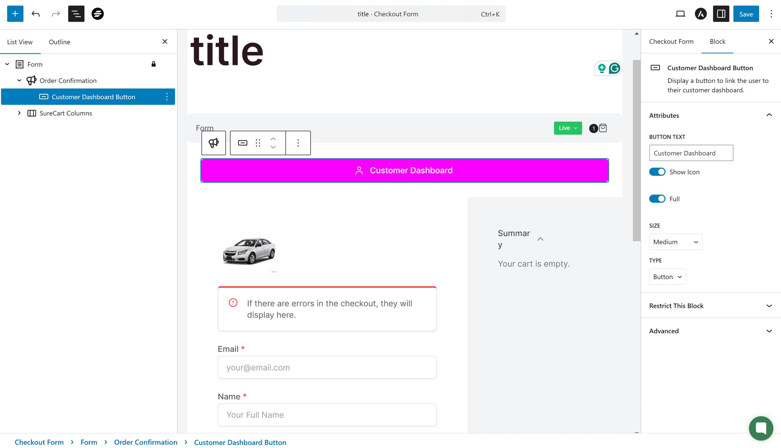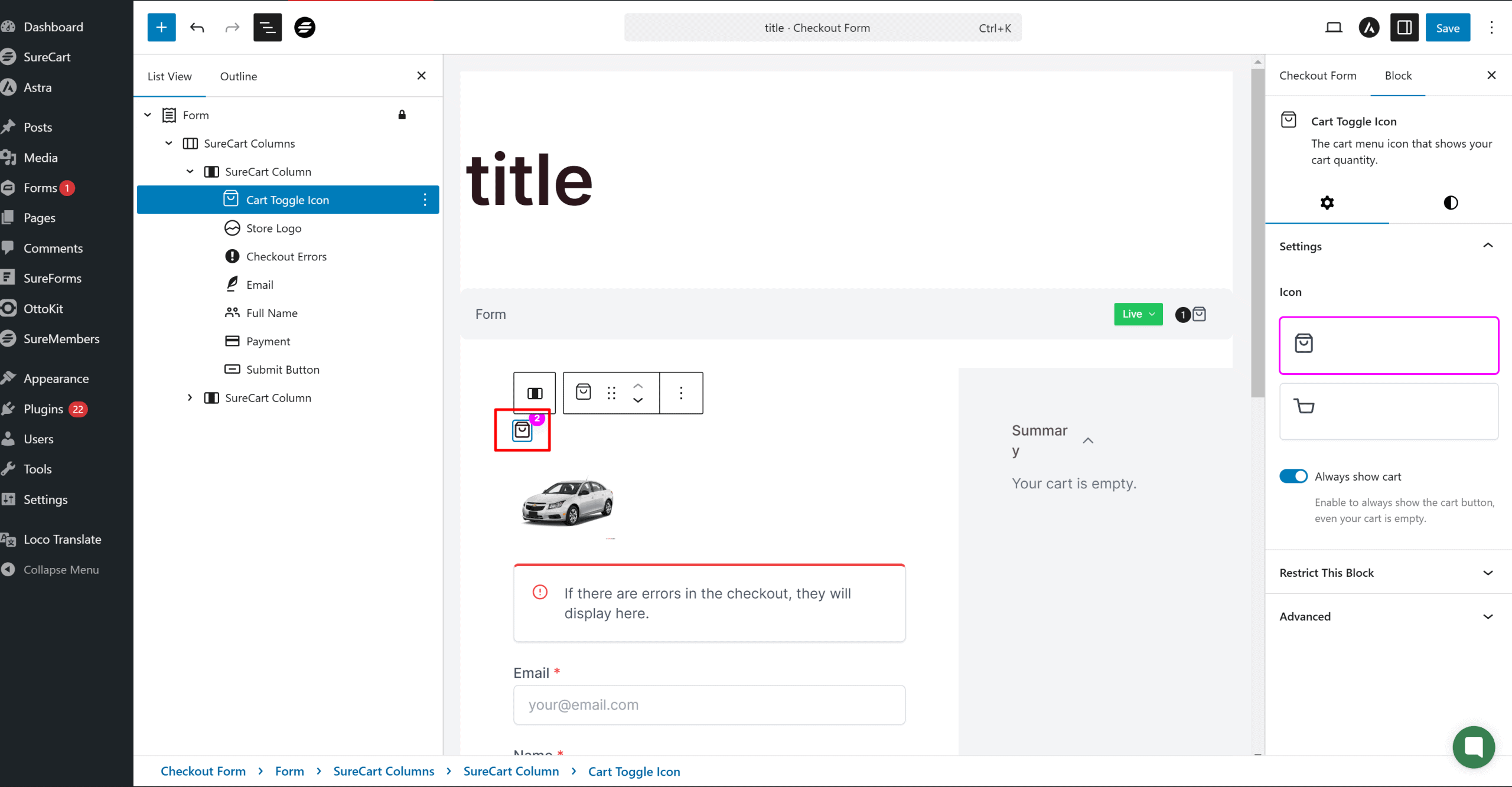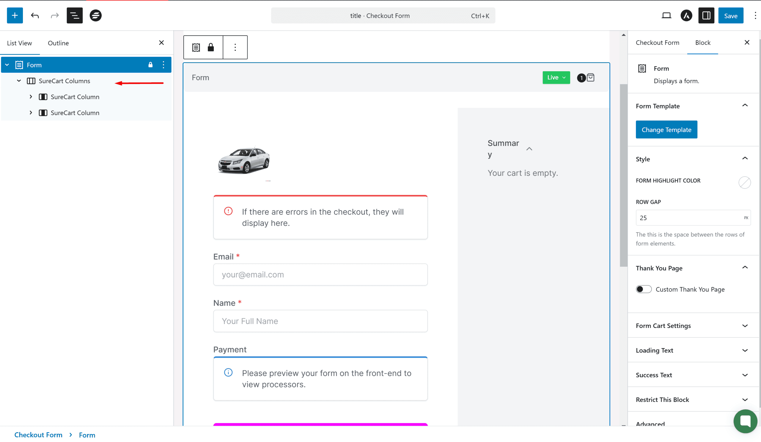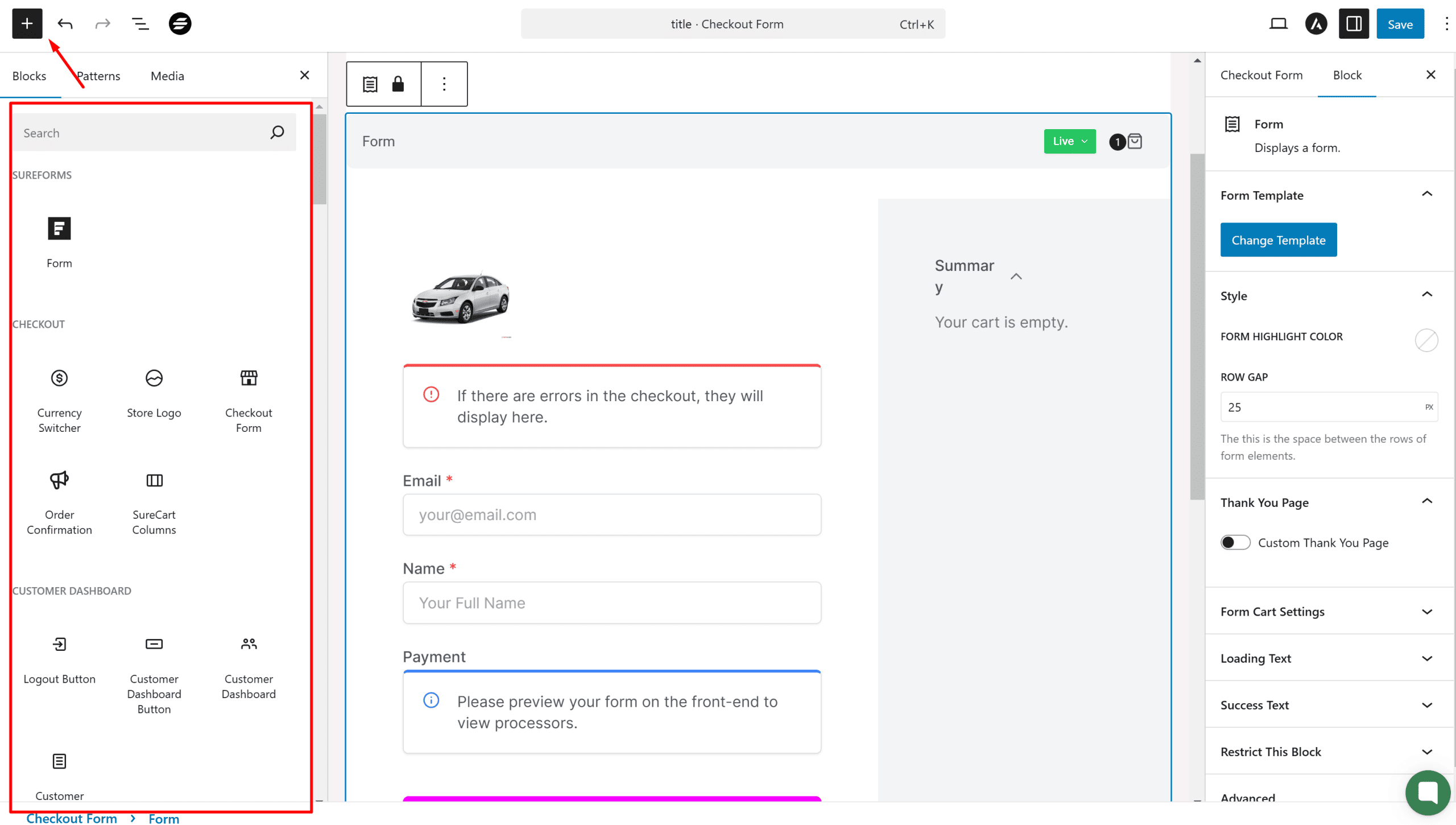 A checkout form in SureCart is like the digital equivalent of a cashier’s counter in a physical store. It’s a customizable online form that plays a central role in helping customers complete their purchases smoothly on a website.