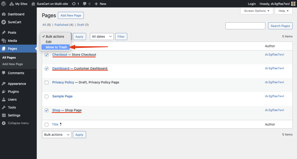 - Clean Up Unnecessary Pages: SureCart might have created pages like the Customer Dashboard and Checkout page on the main site or other subsites. You should delete these to prevent any leftover configuration issues.