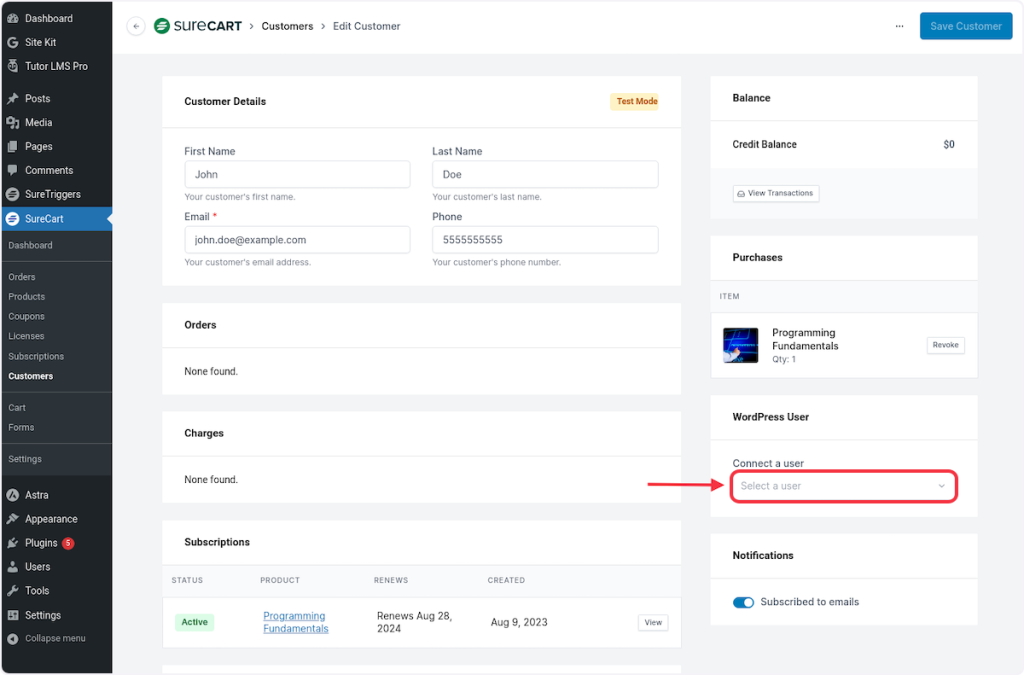Just to check, go to one of the imported customers and look in the WordPress User section. You will see there are no users connected to this SureCart customer. But by syncing customers with WordPress users, you can assign a user role to multiple customers at once.