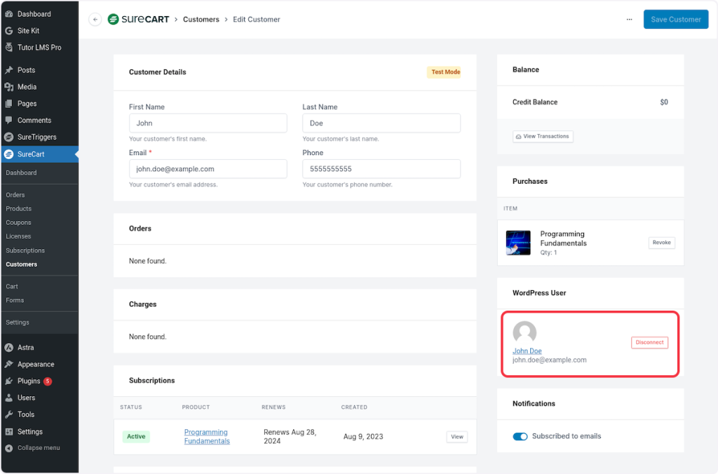 You just synced all your SureCart customers with WordPress. You can go back to the same customer and check that now you have a WordPress User linked with the SureCart Customer.
