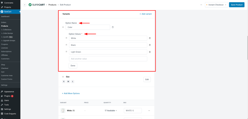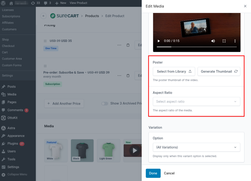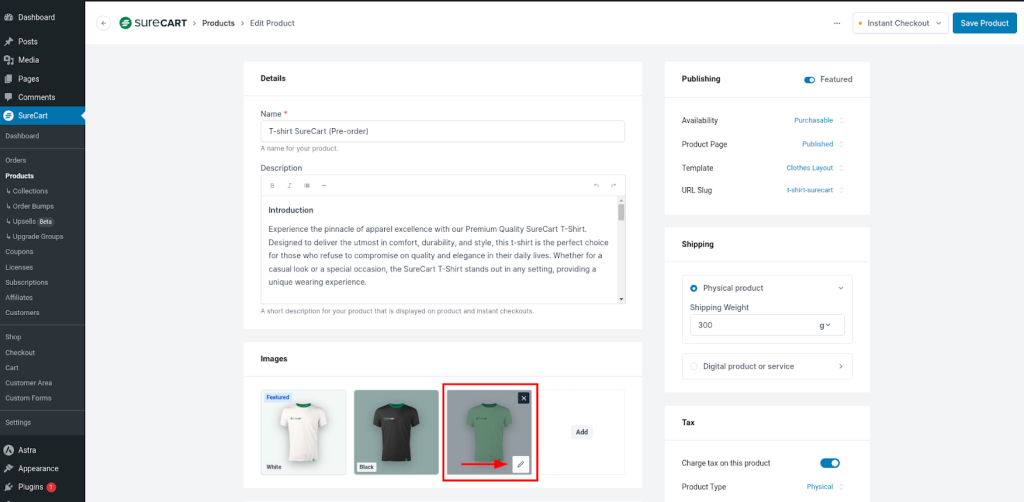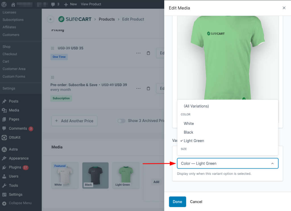 In SureCart, you can link images to specific product variants to ensure the correct image is displayed when a customer selects a variant option (e.g., color, size) on the product page. This guide will walk you through the steps to link an image to a variant using SureCart settings and the WordPress Media Library.