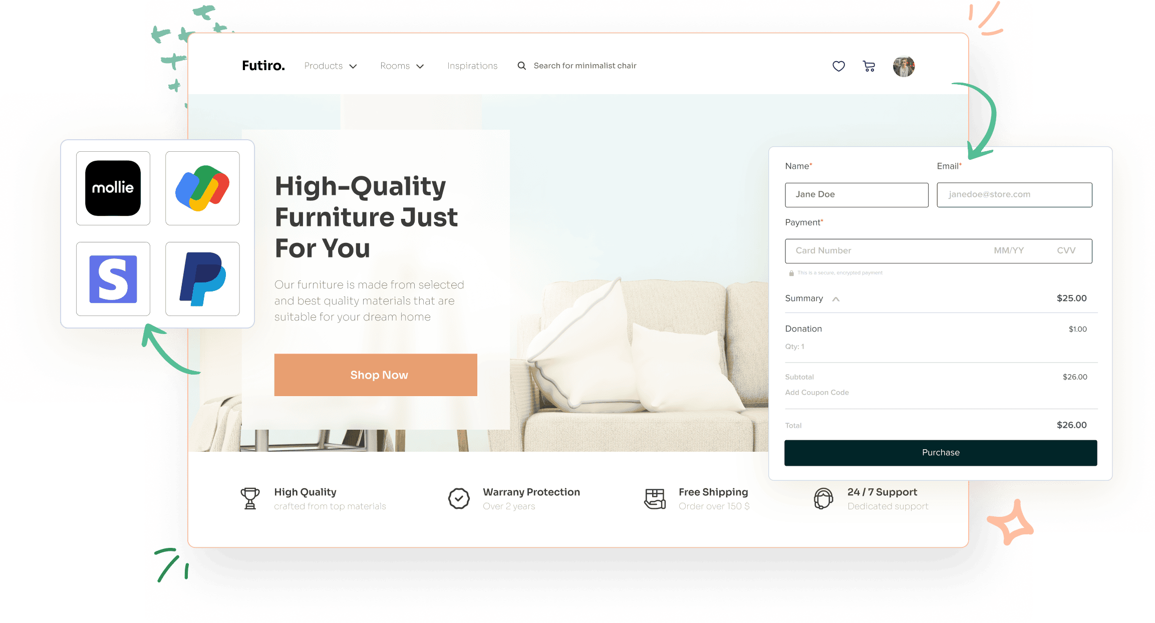 Apple Pay, Google Pay, and Stripe make it easier for your customers to complete the purchase in a single click – without filling in their data.