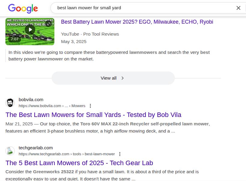 A search for “best lawn mowers for a small yard” returns mostly articles with product reviews.