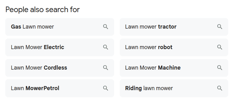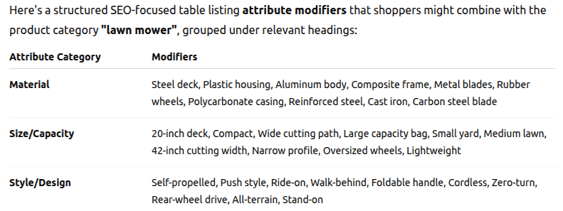 Keyword modifiers are phrases people add to the main product keyword to narrow down their search, like adding “push” or “cordless” to the “lawn mower.” Getting as many of those modifiers as you can helps you optimize your category and product pages for very specific keywords and potentially improve the conversion rate.