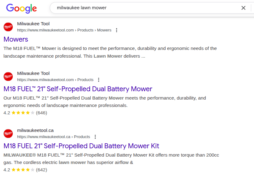 A search for “Milwaukee lawn mower” returns mostly pages from the manufacturer’s website.