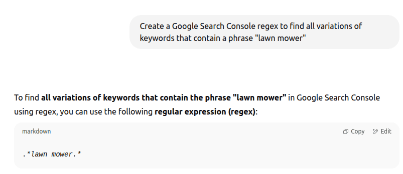 Another method is to search your Google Search Console with a regular expression to find all the keyword variations related to the main keyword. Use ChatGPT or another LLM to create a regex for this task.