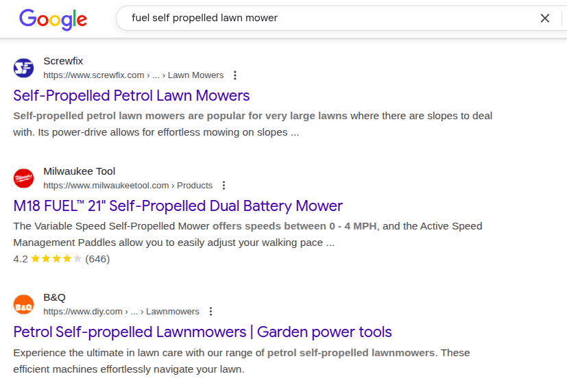 This search for “fuel self-propelled lawn mower” returns mostly category pages on different websites.