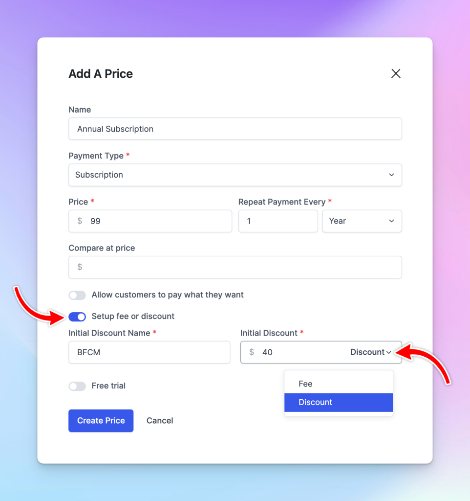 SureCart has always offered Setup Fees for subscriptions, so we have modified this to enable you to add a setup fee or a discount on the first payment.